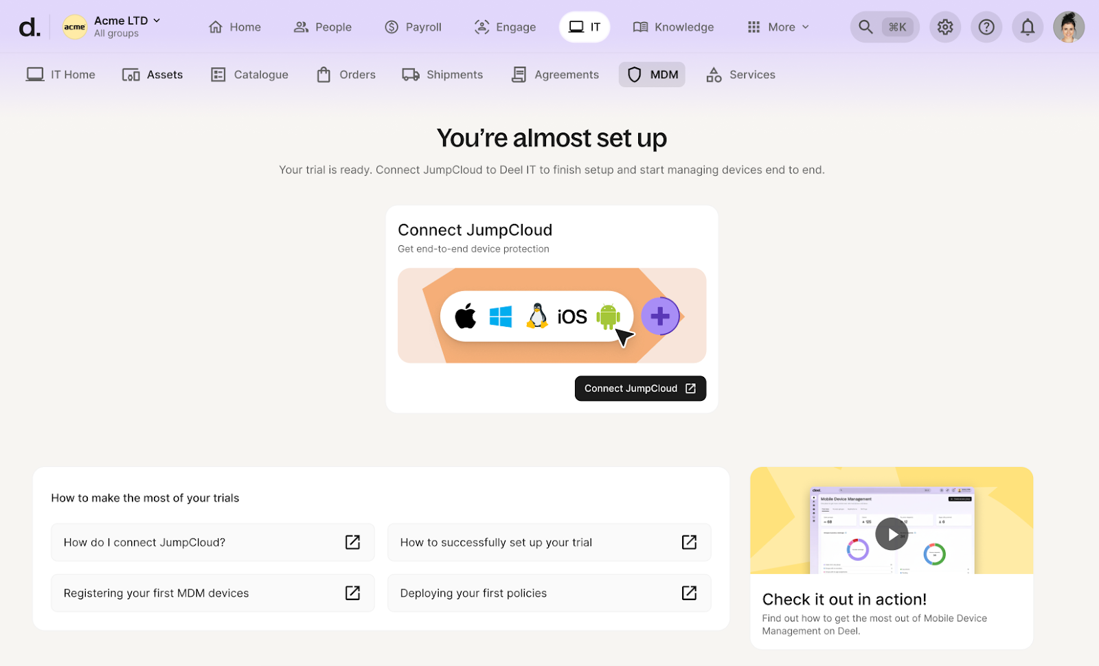 - Connect: After creating your JumpCloud account, go to your Deel account and navigate to Equipment > MDM.