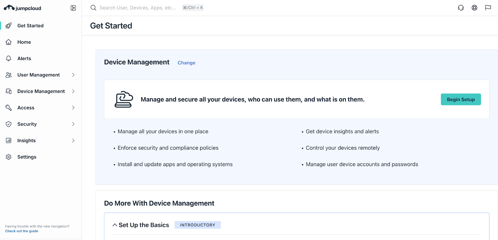 - Get started > Device Management > Begin setup (recommended if you are a first-time user), or
