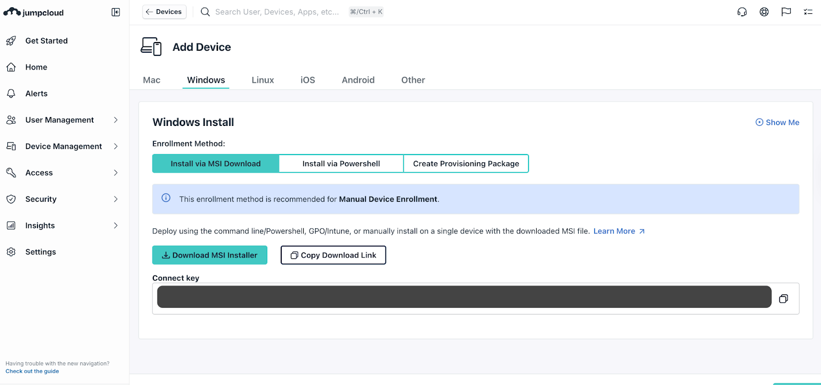 - Navigate to Device Management > Add Device > Windows. You will need both the MSI installer and the Connection Key found here.