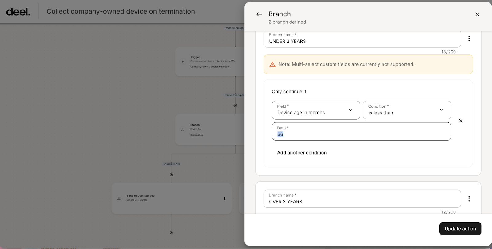 The workflow triggers when a worker's status changes to Offboarded in Deel IT (after their last date of work has passed). Each device is evaluated against the age threshold and routed automatically.