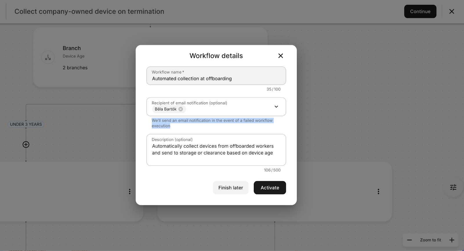 Here, you can add recipients to receive alerts in addition to the workflow creator. We recommend using a group email (e.g., it-ops@yourcompany.com) as the notification recipient. If the original creator has been offboarded, deactivate their workflow and recreate it under an active team member.